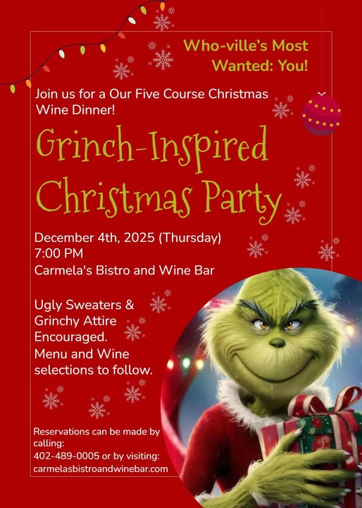 Join us for Carmela's annual five-course Christmas Wine Dinner - A Grinch Inspired Christmas Party. Ugly sweaters and Grinchy attire encouraged. Menu & wine selections to follow. Five-courses with wine […]